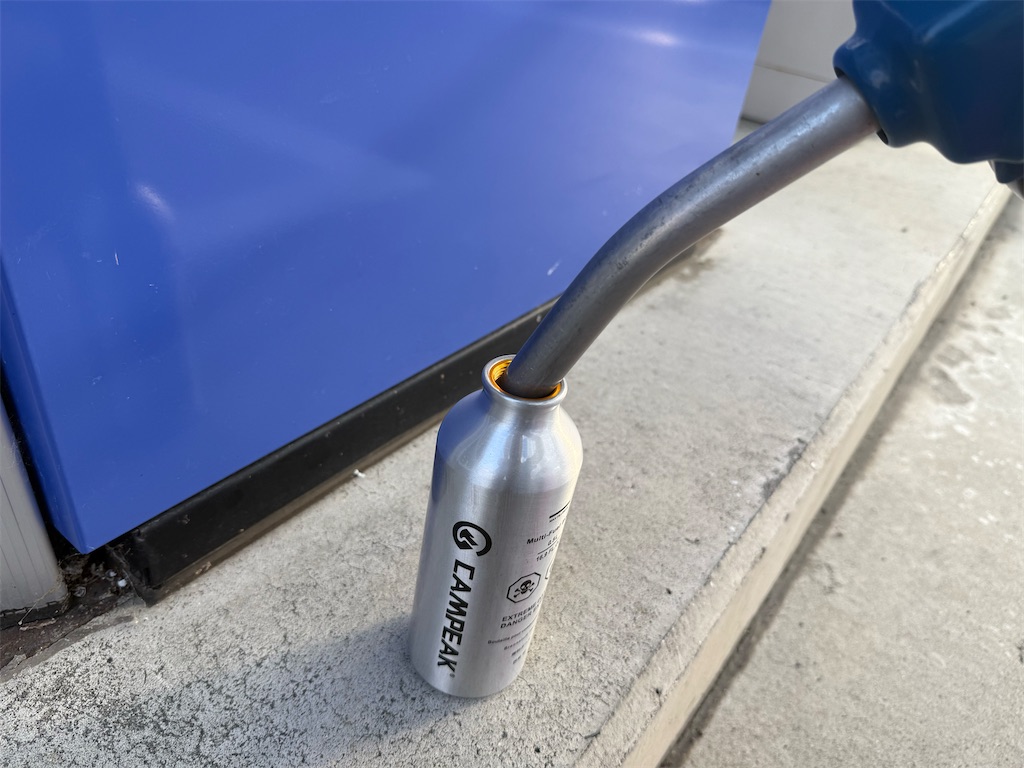 ✅我が家では実際に、500mlのSEIDO フューエルボトルを使って給油しました。口が広めのボトルなら、ノズルをそのまま差し込んで給油できます。